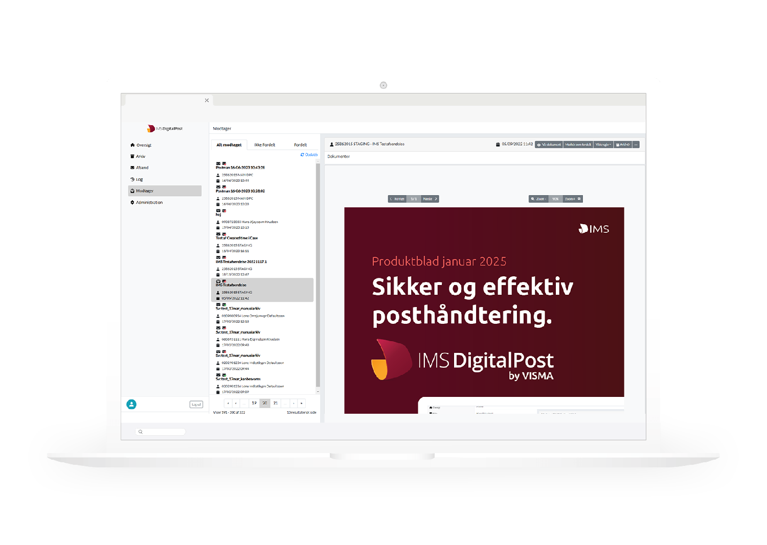 Med IMS DigitalPost har du mulighed for at sende breve til privatpersoners CPR nr, som modtages i e-boks, eller til virksomheders virk postkasse (virk.dk) via CVR nr.